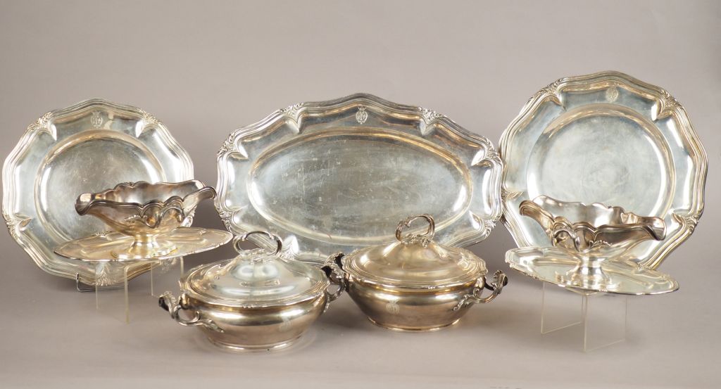 Ensemble de pièces de forme de style Louis XV en argent, poinçon Minerve, modèle feuillagé et armorié. Comprenant : - une paire de saucières (avec leurs doublures en métal argenté) - une paire de légumiers (avec leurs doublures en métal argenté) - deux paires de plats ronds. Diam. 30 cm et 33,5 cm - une paire de plats ovales. Long. 44,5 cm M.O : E. Puiforcat Poids. 8857 g