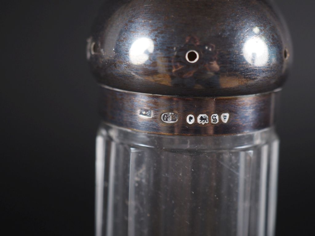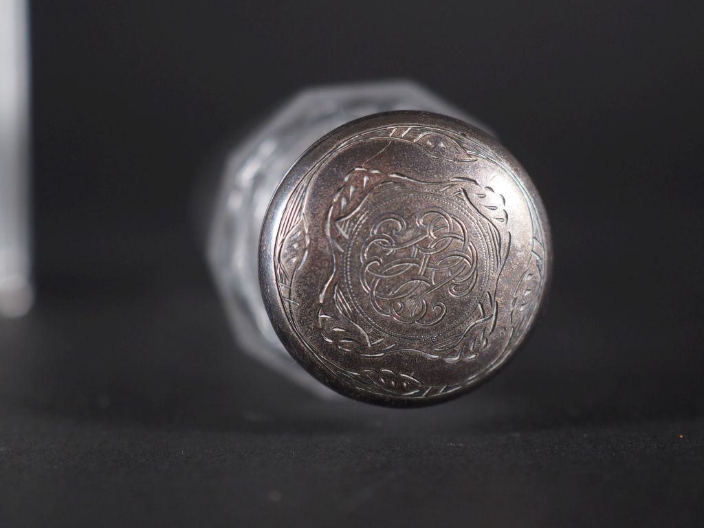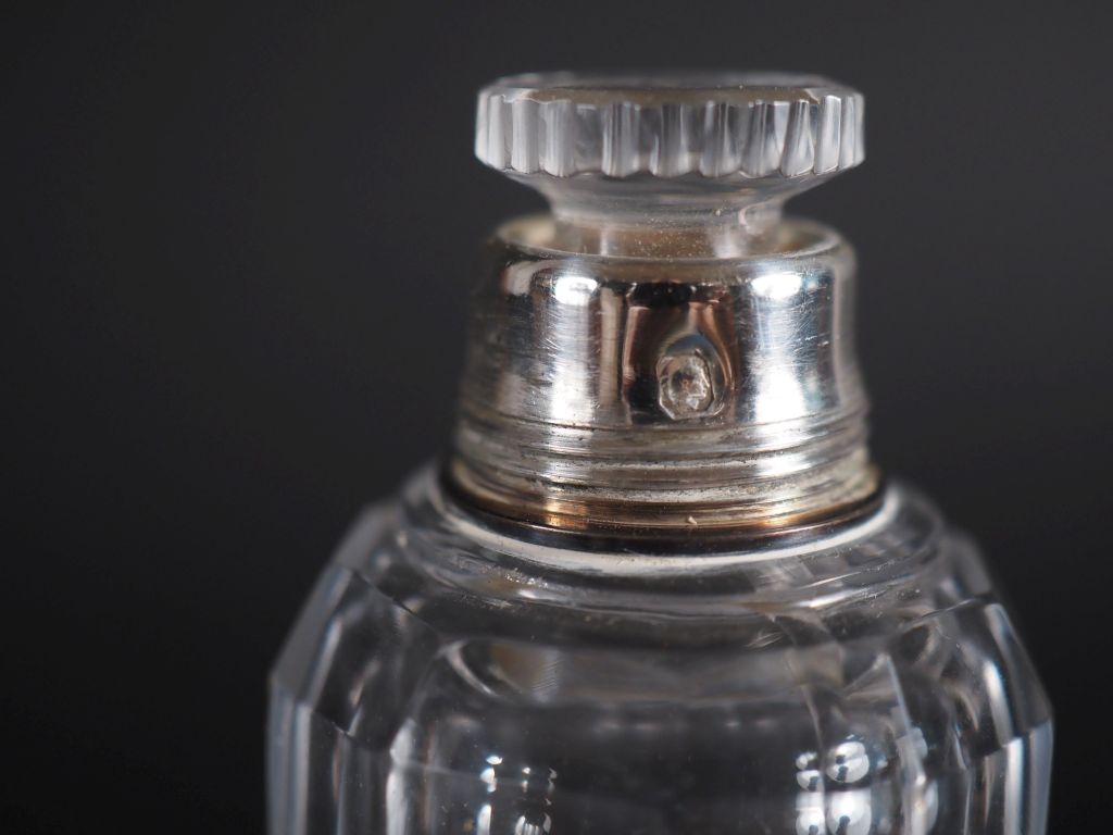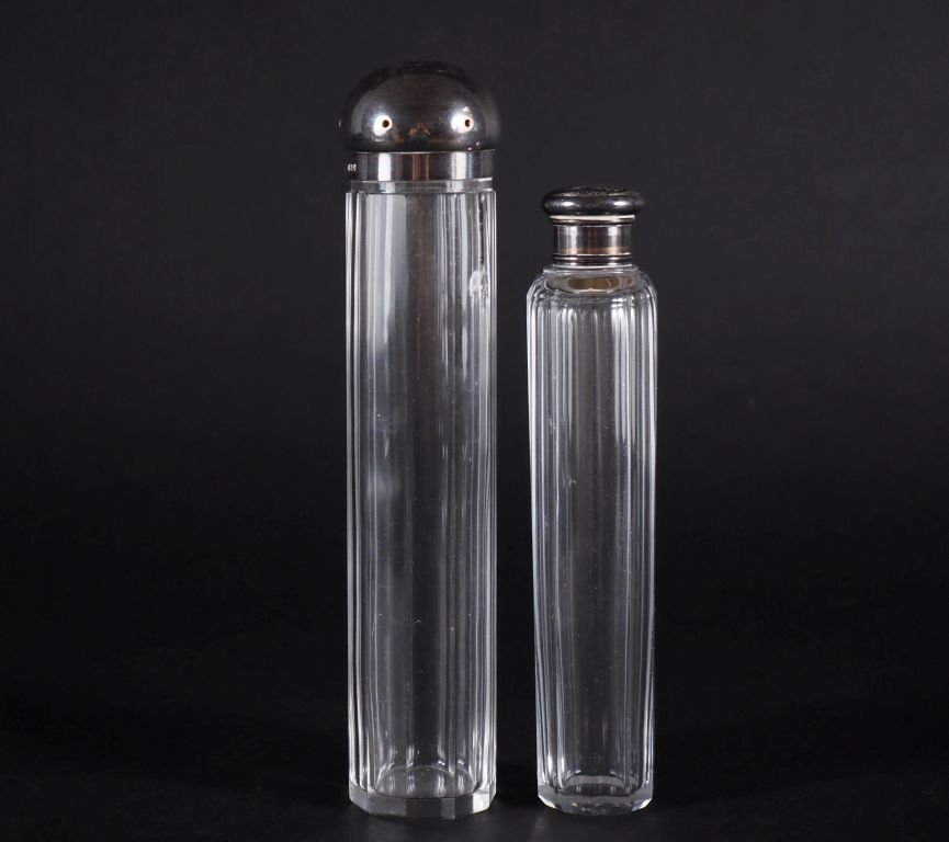 Flacon à pans coupés monture et bouchon argent poinçon Minerve, chiffré H : 17 cm flacon à pans coupés monture et bouchon en argent anglais, H : 20.5 cm