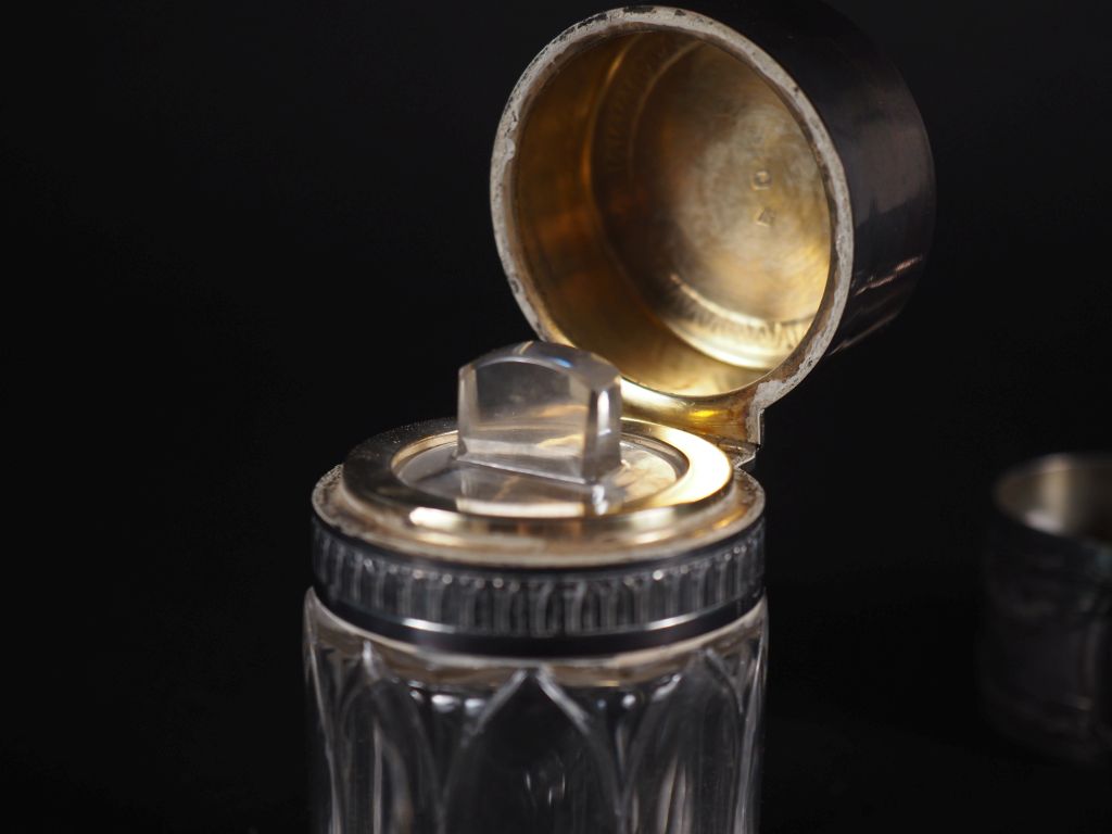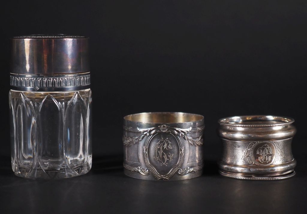 Flacon en cristal à décor de motifs géométriques, couvercle en argent 925 Poinçon Minerve H. 9,5 cm on y joint 2 ronds de serviettes en argent 925 de style Louis XVI Poids : 77 g (frise de perle à ressouder)