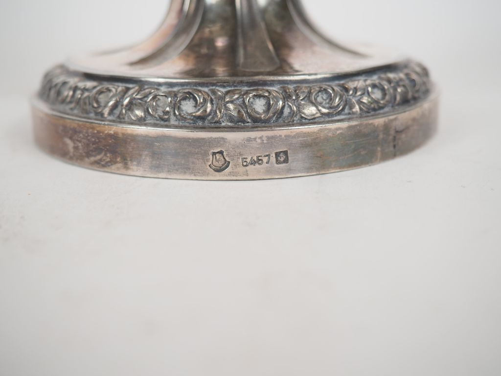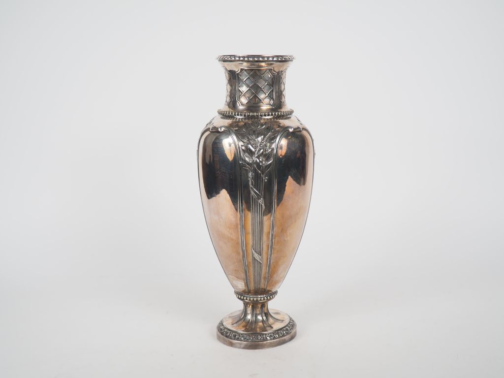 GALLIA. Vase ovoide en métal argenté de style Louis XVI à décor de feuillage, de fleurs, de perles et de treillis. H. 36,5 cm