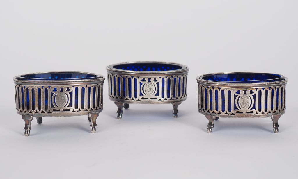 Garniture de table XVIIIème en argent comprenant trois salerons, à décor ajouré d'arcatures et de médaillon monogrammé. Avec leur verrine. Reposant sur quatre petits pieds. 4,2 x 7,6 x 5,5 cm Poids. sans les verrines : 146 g