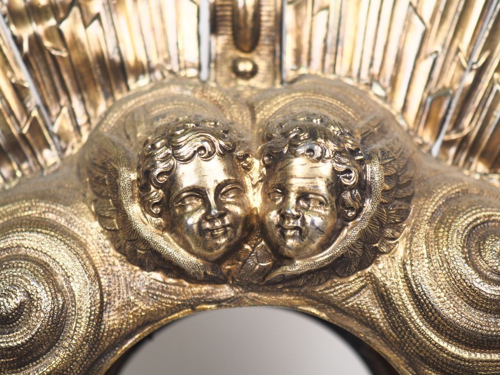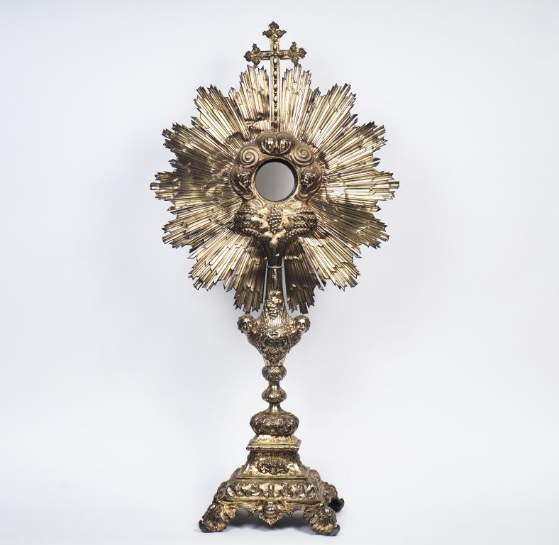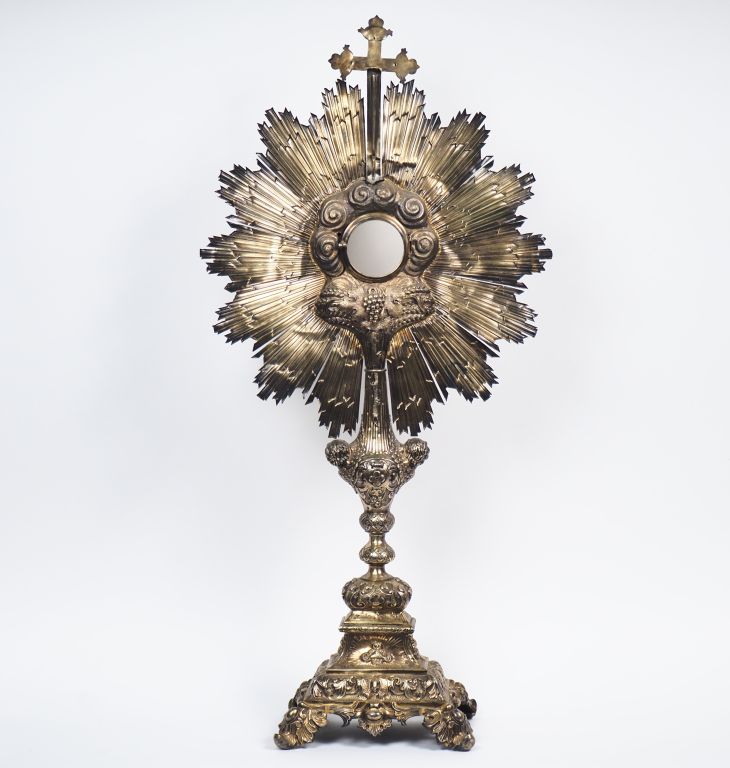 Grand ostensoir en vermeil 925, poinçon Minerve, motif central rayonnant agrémenté d'une croix, de têtes d'angelots, d'épis de blé et de pampres. Reposant sur quatre pieds feuillagés, la base à décor de rinceaux et de l'Agneau Pascal. H. 80 cm Poids. 1370 g (petits accidents)