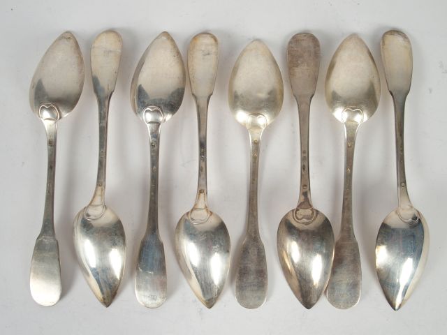 Huit grandes cuillères en argent, poinçon Minerve, modèle uniplat. Poids : 543 g