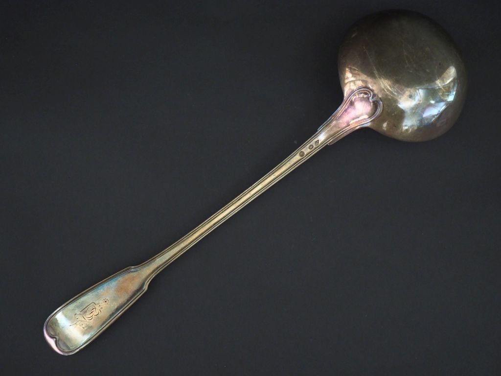 Importante louche début XIXème en argent 950, poinçon au 2ème Coq, modèle à filet. Armoriée. Long. 36,4 cm Poids. 319 g