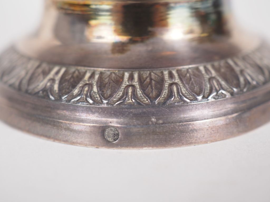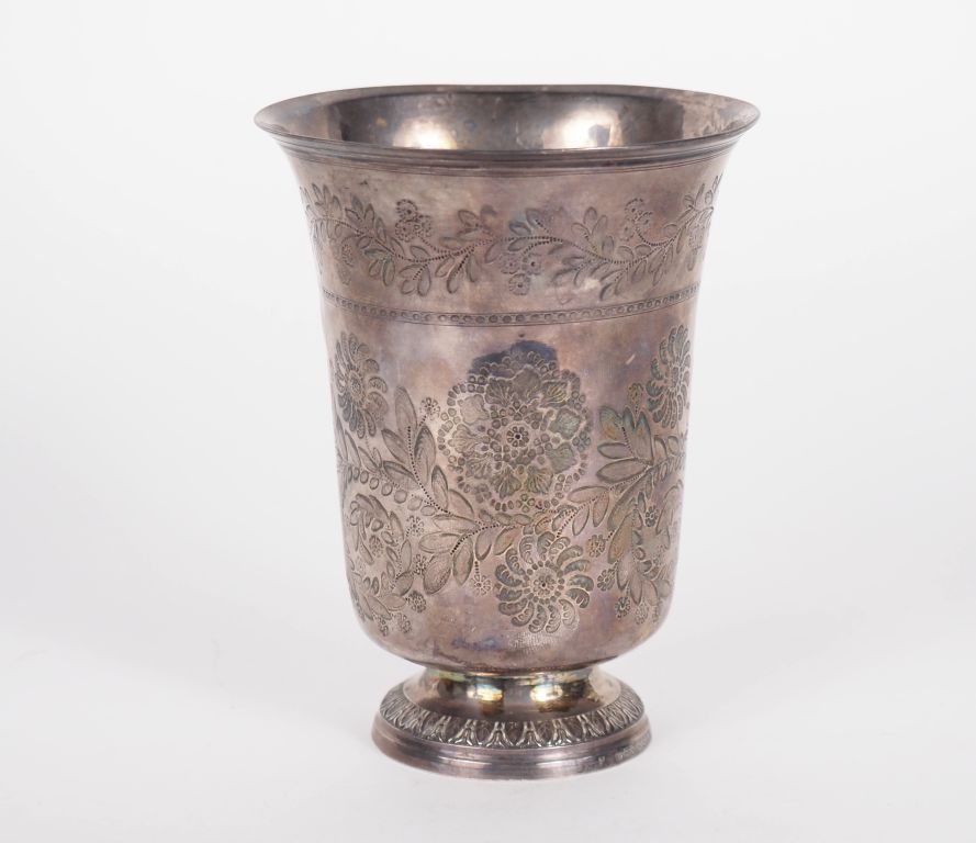 Importante timbale Restauration de forme tulipe en argent 950, poinçon Vieillard, à décor gravé de branchage fleuri. Le piédouche agrémenté d'une frise de feuilles de laurier. Gravée. M.O : T.T H. 13,1 cm Poids. 129 g