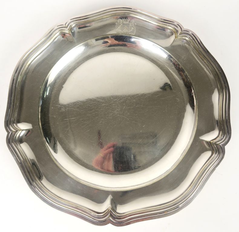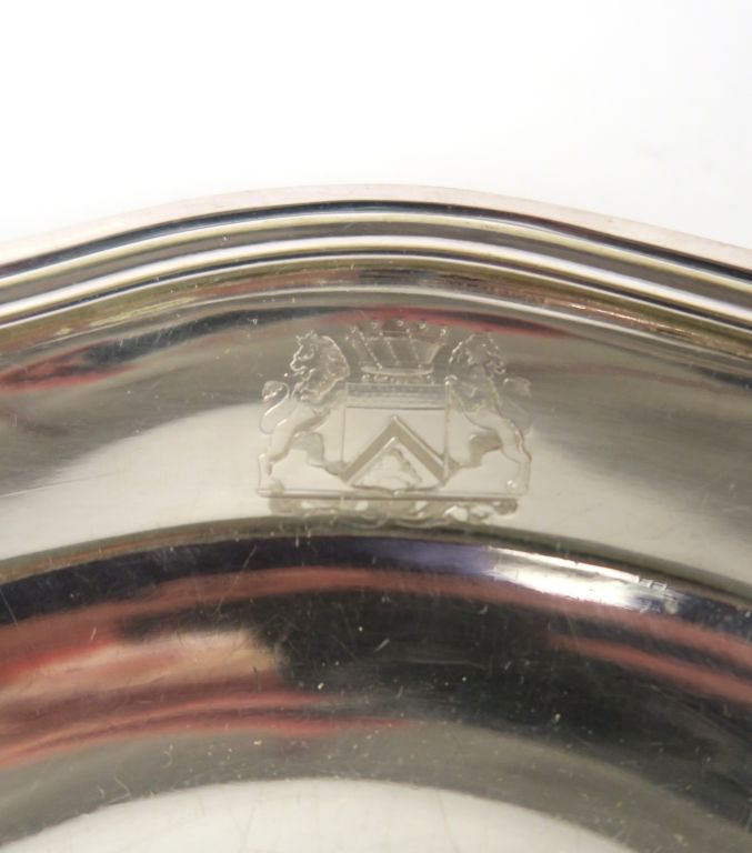 Jatte ronde de style Louis XV en métal argenté, armoriée.