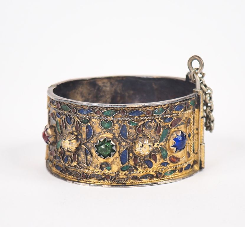 Large bracelet jonc Afrique du Nord en argent bas titre, émail polychrome et verroteries. 5,4 x 5,8 cm Poids tel. 46 g (petits manques)
