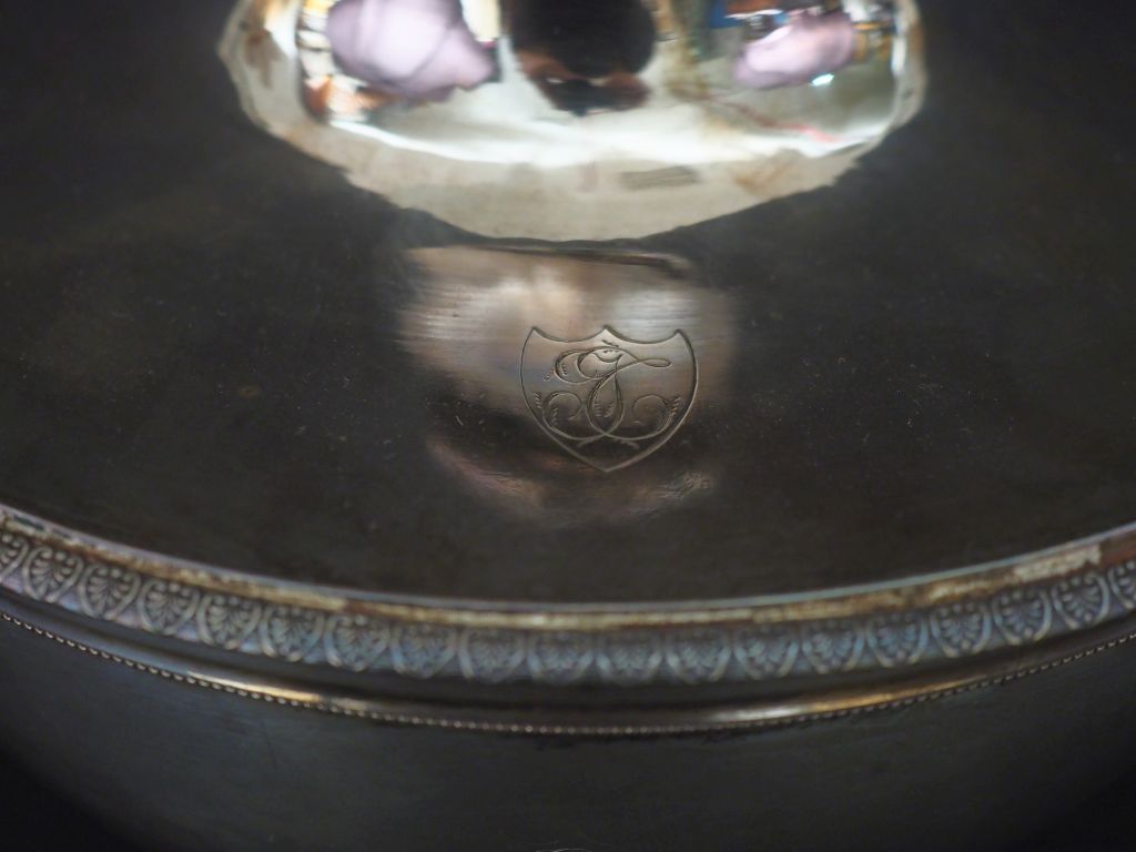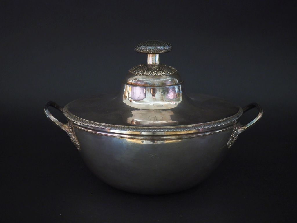 Légumier début XIXème en argent 950, poinçon au 2ème Coq, à décor de frise de palmettes et de rang de perles. Prise du couvercle et attaches des anses feuillagées. Monogrammé. H. 18 cm Long. 28,5 cm Diam. 23 cm Poids. 1308 g