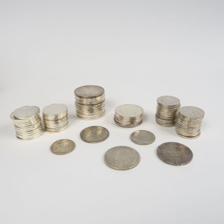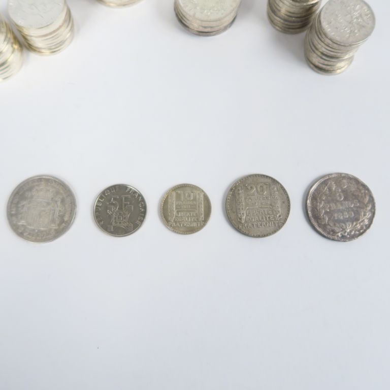 Lot de pièces en argent : - 25 pièces de 5 Francs en argent. 299 g - 13 pièces de 50 Francs en argent. 390 g - 24 pièces de 100 Francs en argent. 361 g - 6 pièces de 10 Francs en argent. 150 g - 1 pièce de 5 Francs argent 1854 - 1 pièce de 5 , 1871 - 1 pièce de 20 Francs argent 1934 - 1 pièce de 10 Francs argent 1931 - 1 pièce de 5 Francs 1889