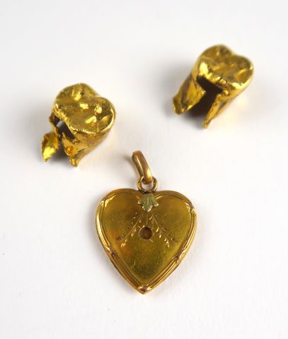 Lot d'or comprenant un pendentif en forme de cœur et deux dents (partie de céramique restante). Poids tel : 7,39 g