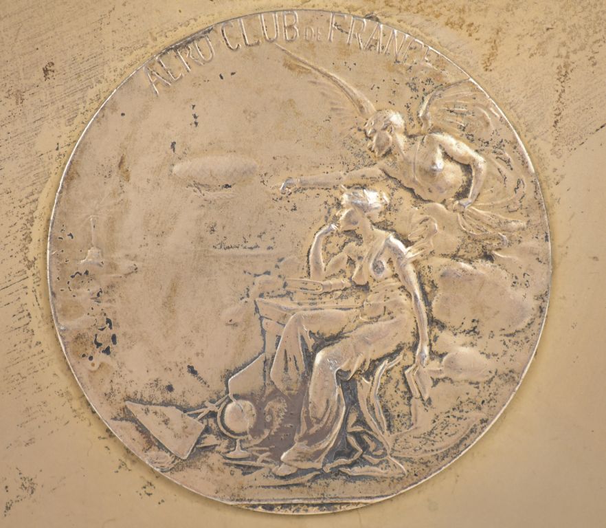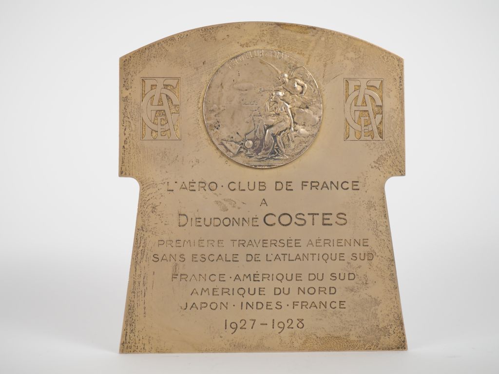 Médaille en argent de l'Aéroclub de France sur une plaque en métal argenté gravée : L'Aéro club de France à Dieudonné Costes, Première traversée Aérienne sans escale de l'Atlantique Sud, Amérique du Nord - Japon- Indes - France. Poids total : 455 g Diam. 5 cm Dim. 15 x 13 cm