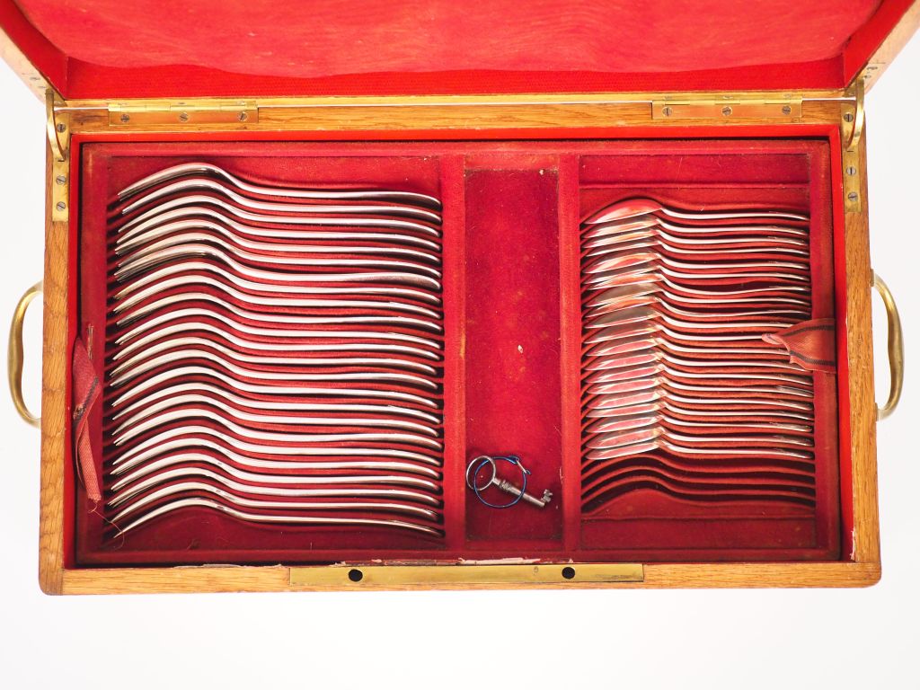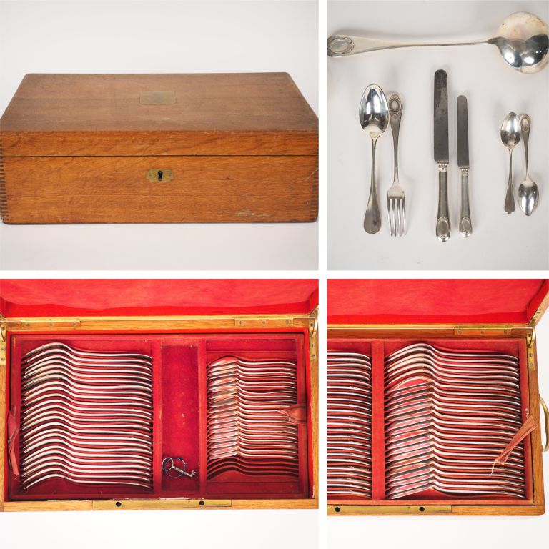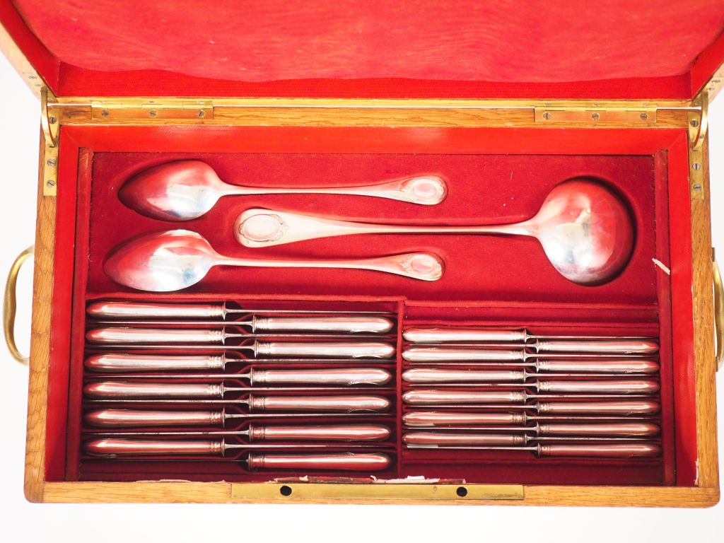 Ménagère de style Louis XVI en argent, poinçon Minerve, modèle à cartouche feuillagée. Comprenant : - trente-six grands couverts - douze grands et douze petits couteaux, manche argent fourré, lameacier - vingt petites cuillères - une louche - deux cuillères à servir M. O : Dans son coffret en chêne. Poids. 7909g