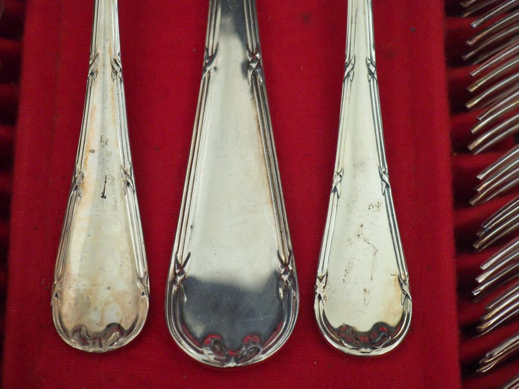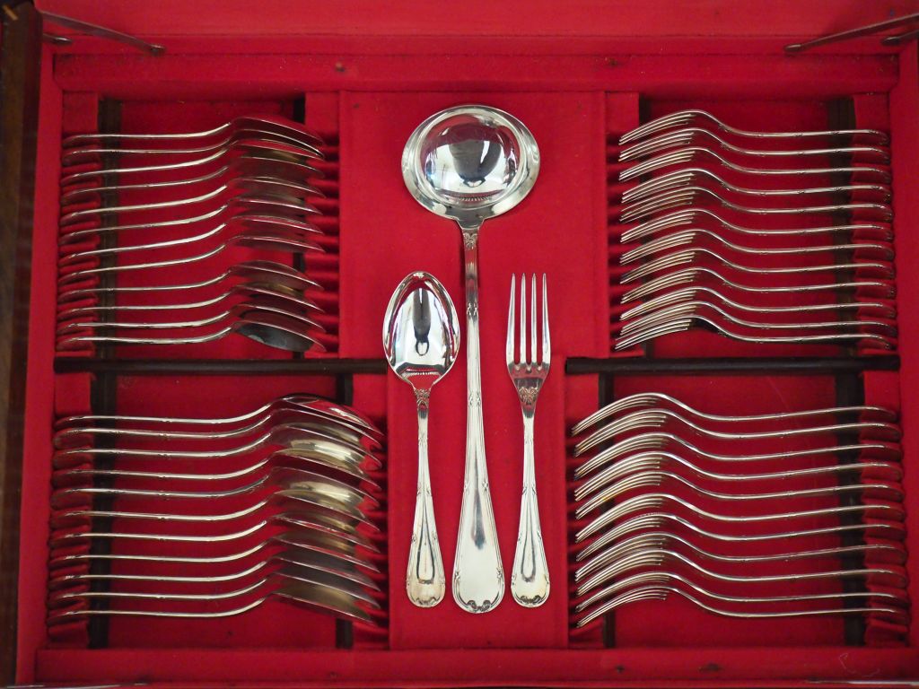 Ménagère de style Louis XVI en métal argenté, à décor de tiges enrubannées. Comprenant : - douze grands couverts - douze couverts à entremets - douze couverts à poisson - douze grands couteaux - douze petits couteaux - douze cuillères à dessert - douze cuillères à moka - une louche - un couvert à découper (couteau et fourchette) - un couvert à servir la salade - une cuillère à ragout - une cuillère à sauce - une cuillère à crème - un couvert à servir le poisson M.O : FRACALANZA Dans son coffret