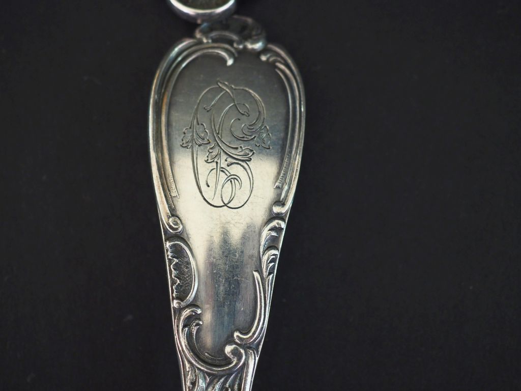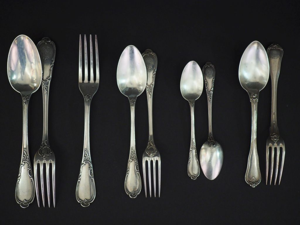 Ménagère de style Rocaille en argent, poinçon Minerve, monogrammée comprenant : 18 grands couverts 18 fourchettes 18 cuillères 18 couverts à entremets 18 petites cuillères Poids : 6974 g On y joint un couvert dépareillé en argent Poids : 98 g