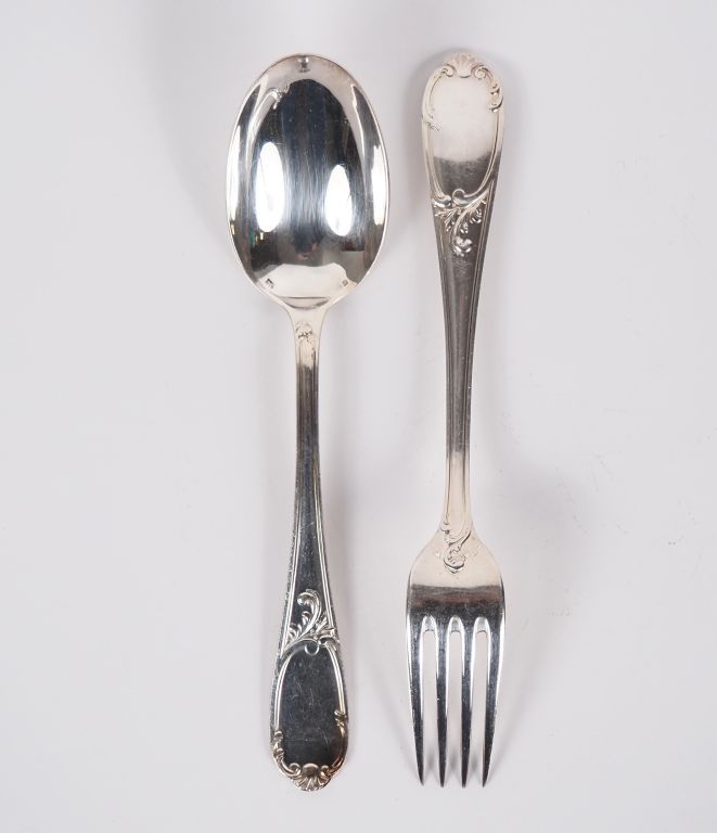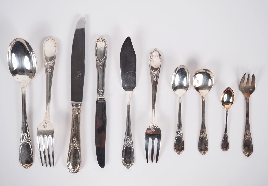 Ménagère en métal argenté de style Louis XV comprenant : une louche une cuillère à ragout 12 grands couverts 12 cuillères à entremets un service à découper un couvert à salade 12 cuillères à glace 12 fourchettes à gateaux 12 cuillères à café louche à crème pelle à tarte couvert à glace pince à sucre 12 couverts à poisson un couvert à servir le poisson 12 grands et 12 petits couteaux 12 fourchettes à huitre 4 pièces de service à hors d'œuvre