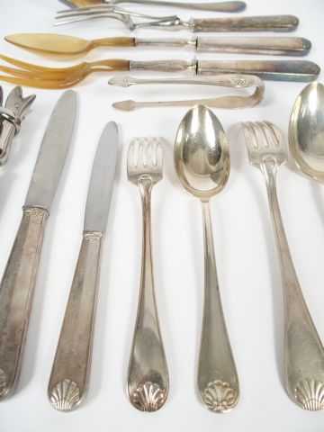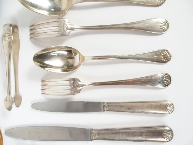 Ménagère en métal argenté, modèle à double coquille, comprenant 12 grands couverts, 6 couteaux, 5 couverts à entremets, 12 petits couteaux, pince à sucre, cuillère de service, manche et fourchette à gigot, couvert à salade.