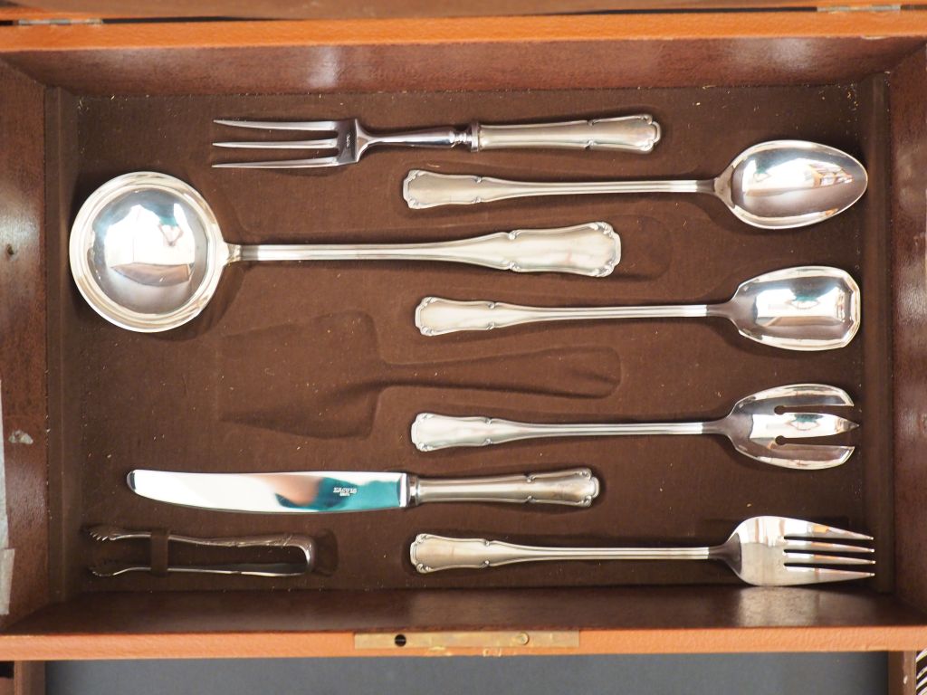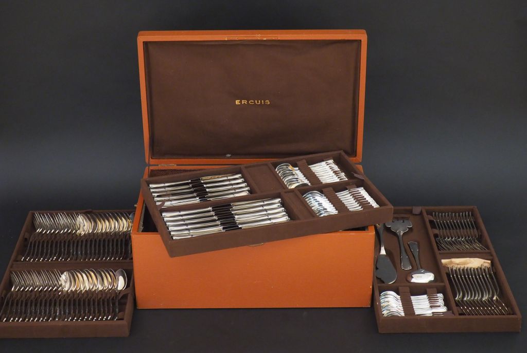 Ménagère Ercuis en métal argenté modèle feuillagé dans sa boite d'origine (état neuf) comprenant : 12 grands couverts, 12 couverts à entremets, 12 grands et 12 petits couteaux, 12 couverts à poisson, 12 fourchettes à huitre, 12 couverts à dessert, pièces de service (manque une pelle à tarte)