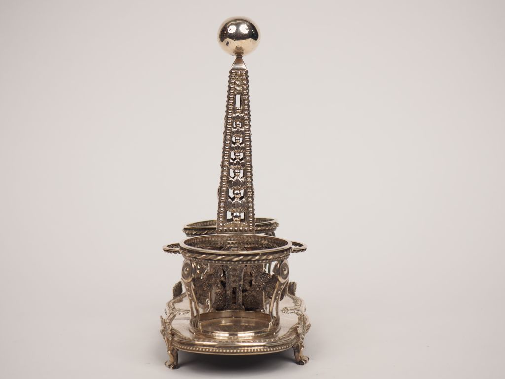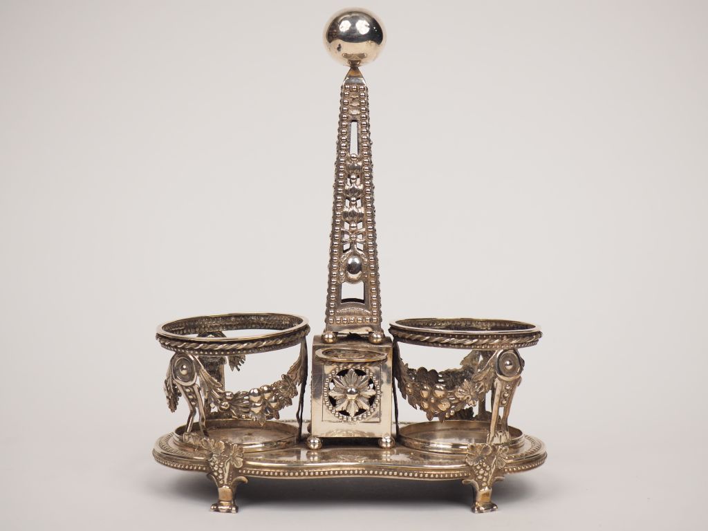 Monture d’huilier Louis XVI en argent, à décor de guirlandes de fruits, de fleurs et de feuillages. Poids. 574 g