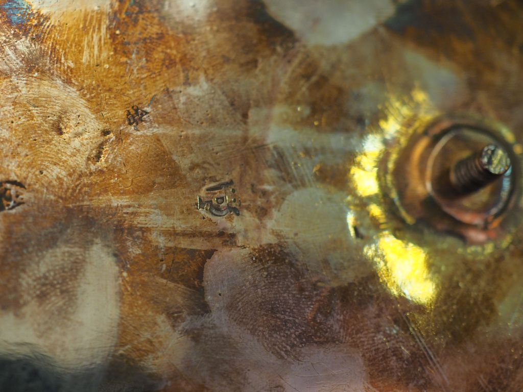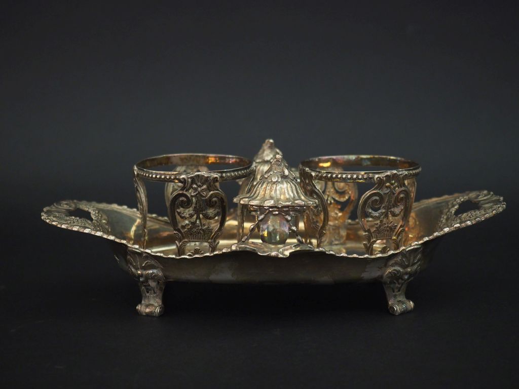 Monture d’huilier XVIIIème en argent, à décor ajouré de panier fleuri, rinceaux et frise de perles. Les extrêmités ajourées, à décor de pampres et enroulements. Reposant sur quatre petits pieds à enroulements. Deux bouchons, à décor de godrons et cannelures, prise à décor de pampres. 8,5 x 28 x 16,5 cm Poids. 638 g