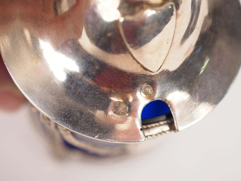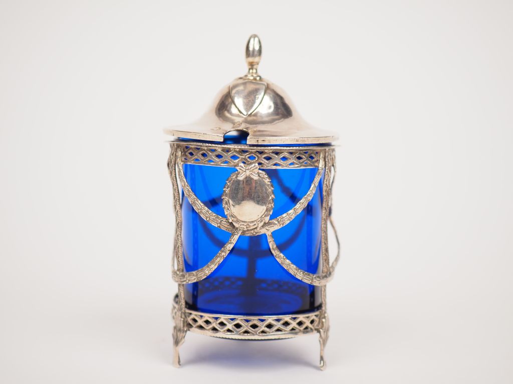 Moutardier de style Louis XVI en argent, poinçon tête de sanglier, à décor de guirlandes et de cartouches. Poids. 70 g