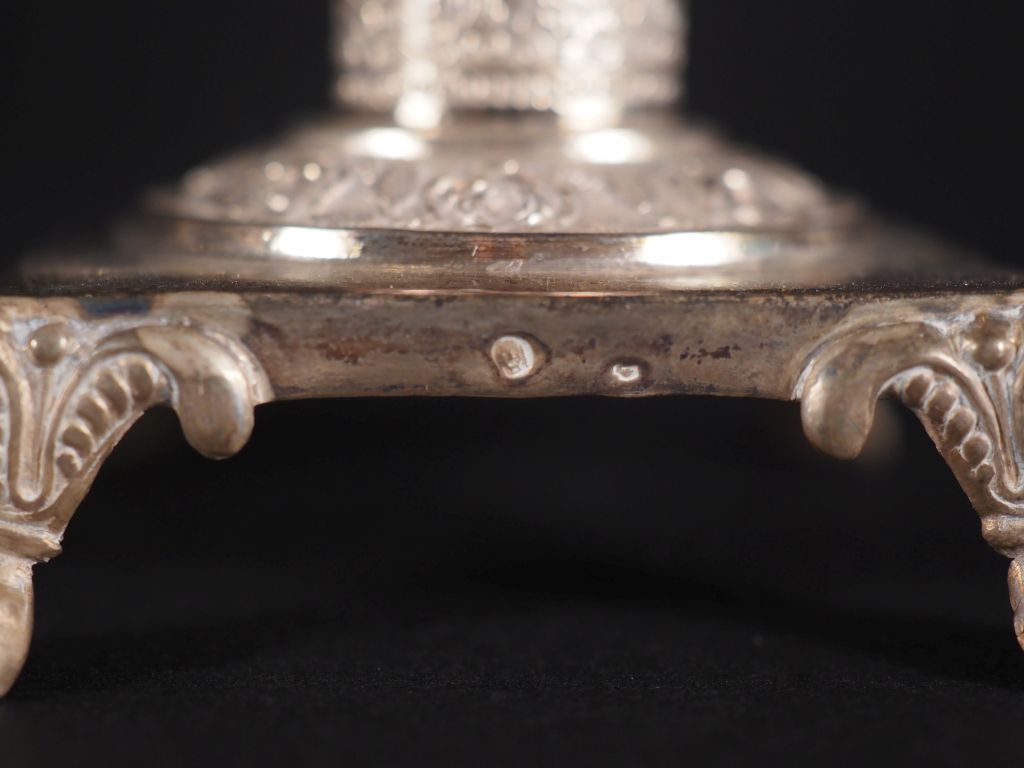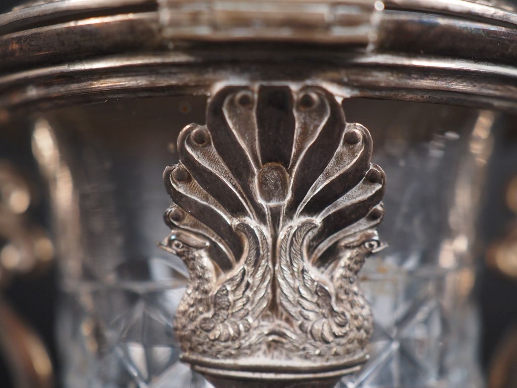 Moutardier en argent 950, Napoléon III de style Louis XVI, à décor de cygnes affrontés et de rinceaux feuillagés, anses à décor de buste d'étalon, prise du couvercle ornée d'une pomme de pin, pieds griffe , avec sa pelle , verrine en cristal Poinçon Vieillard Poids tel : 228 g (petit enfoncement sur le couvercle) Moutardier en argent 925, de style Louis XV à décor rocaille , avec une pelle en métal argenté , verrine bleue Poinçon Minerve MO : Debain Poids : 165 g
