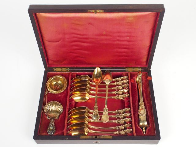 Nécessaire à thé Napoléon III en vermeil, poinçon Minerve, comprenant douze cuillères, pince à sucre, passette et cuillère à thé. Poids : 238 g. Dans son écrin en marquetterie.