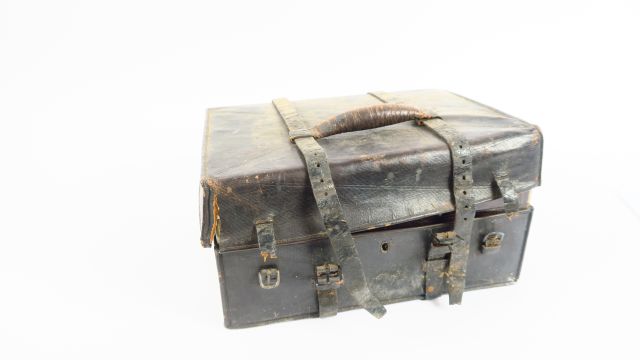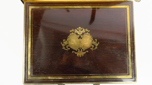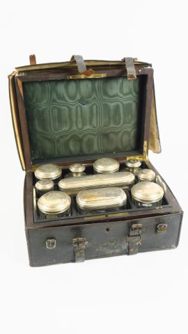 Nécessaire de toilette en argent et cristal dans son coffret en acajou et laiton monogrammé.