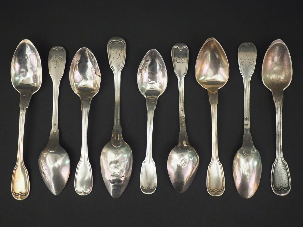 Neuf cuillères à café en argent, poinçon et modèles dépareillés. Monogrammées. Poids. 205 g