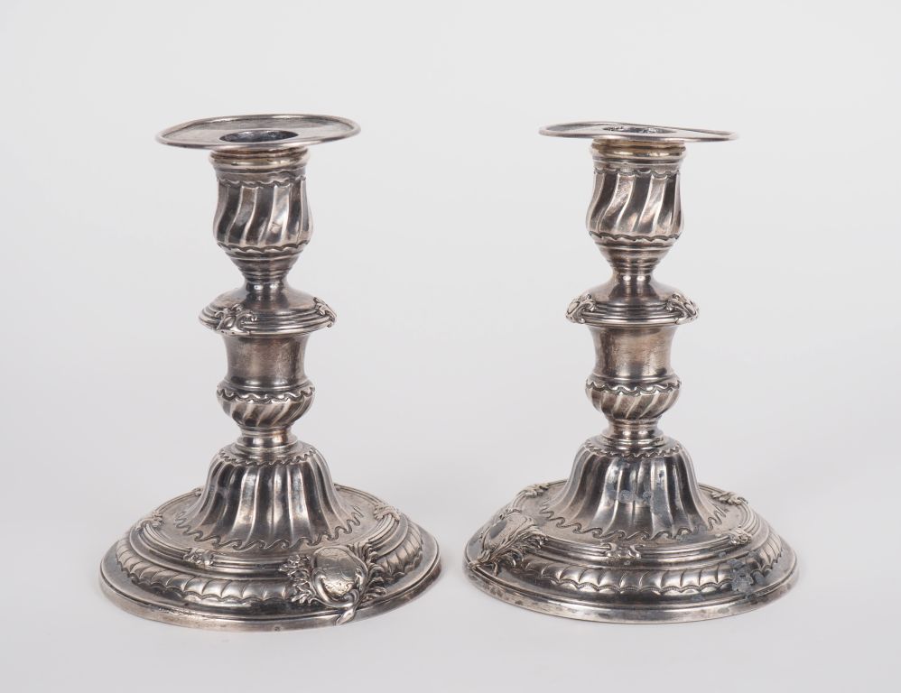 Paire de bougeoirs de toilette XVIIIème en argent, à décor de cartouche armorié, filets et côtes torses. Avec leur bobèche. H. 14 cm Poids. 767 g (légèrement tordus)