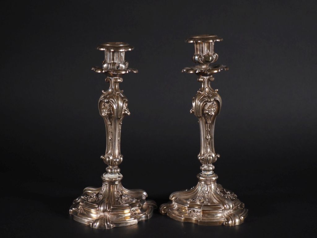 Paire de bougeoirs en argent 925, à décor de fleurs, de godrons et de mufles de lions. Poinçon Minerve H. 27 cm Poids tel : 890 g