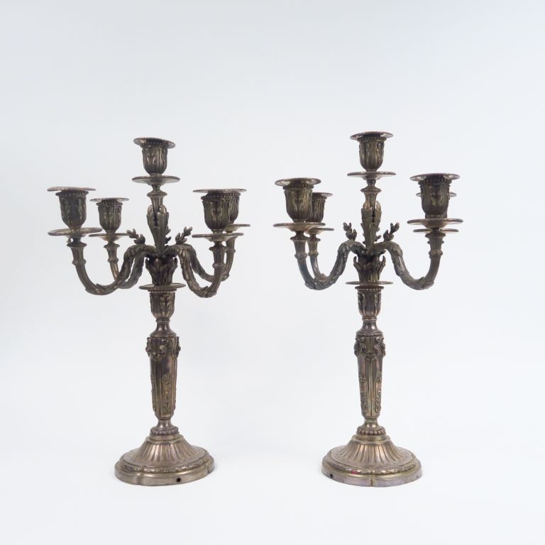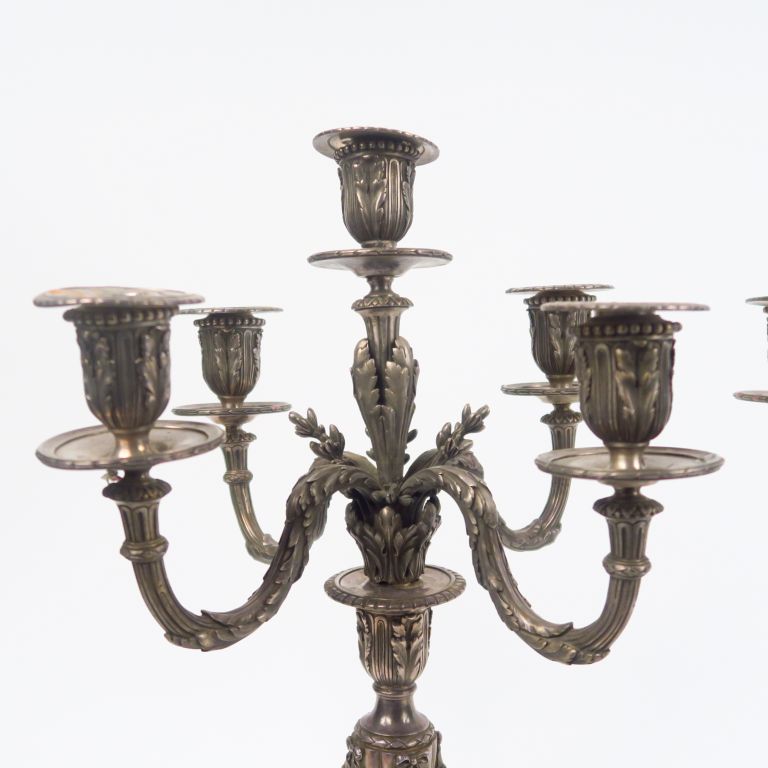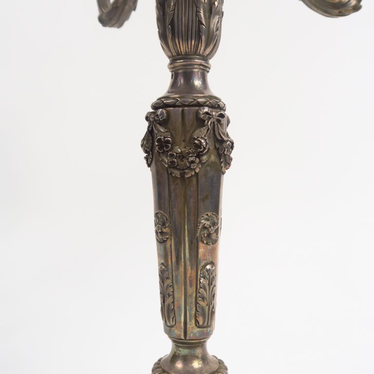 Paire de candélabres de style Louis XVI en argent, poinçon Minerve, éclairant à cinq bras de lumière. Poids. 6389 g (percés)