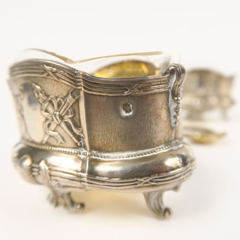 Paire de salerons de style Louis XVI en argent, poinçon Minerve, à décor de torches et de carquois. On y joint deux pelles à sel en vermeil, poinçon Minerve. Poids. 56 g