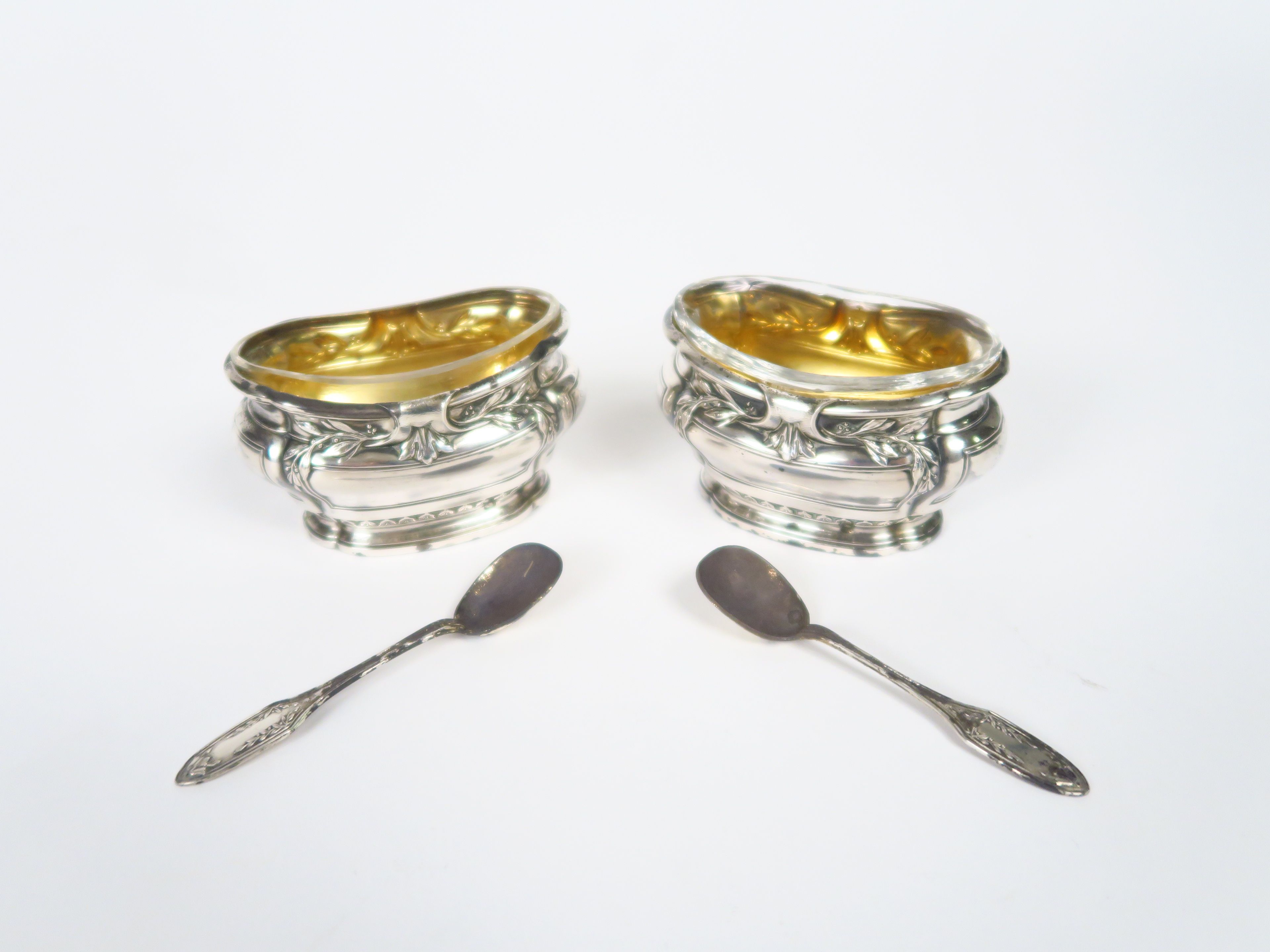 Paire de salerons de style Louis XVI en argent, poinçon Minerve. On y joint deux pelles à sel en argent, poinçon Minerve. Poids. 45 gr