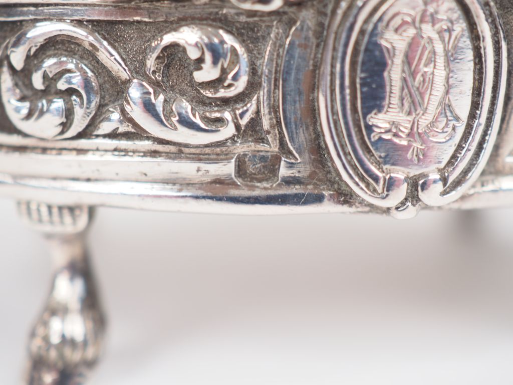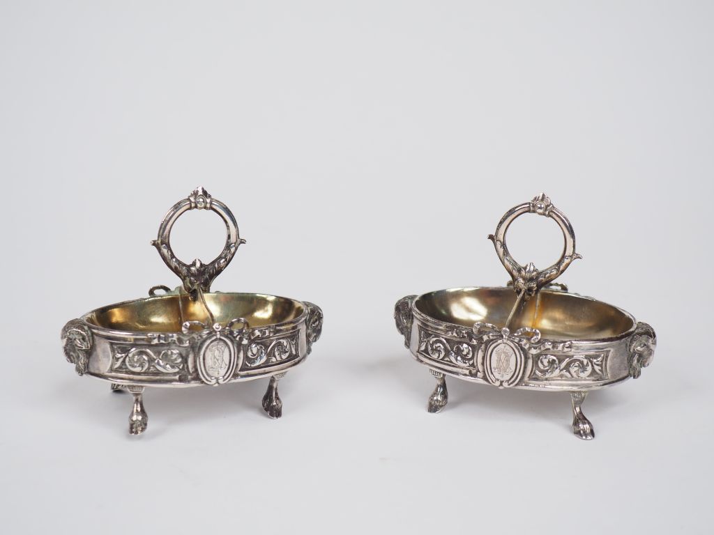 Paire de salerons doubles de style Louis XVI en argent et vermeil, poinçon Minerve, à décor de cartouche monogrammé, de rinceaux feuillagés et têtes de bélier, reposant sur quatre pieds terminés en sabot de biche. Poids. 192 g