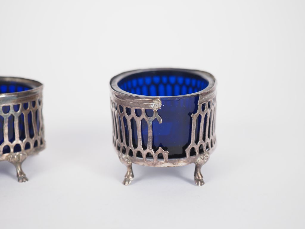 Paire de salerons XVIIIème en argent, à décor ajouré et de cartouches. Avec leur verrine. Reposant sur quatre pieds biche. 4,7 x 7,7 x 5,3 cm Poids. sans les verrines : 64 g (accidents)