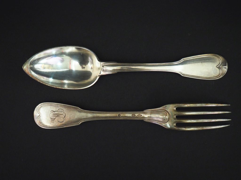 Partie de ménagère en argent 950, poinçon au 2ème Coq, modèle à filets, monogrammé. Comprenant : - douze grandes fourchettes - douze grandes cuillères Poids. 2200 g