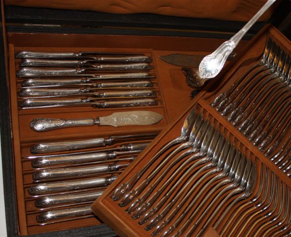 Partie de ménagère en argent, à décor rocaille, comprenant 12 couverts, 12 couverts à dessert, 12 cuillères à moka, 12 grands couteaux, 12 couteaux à dessert, etc. chiffrée. Poids : 3500gr environ