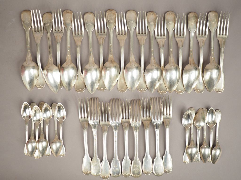 Partie de ménagère en argent, poinçon Vieillard, modèle à filet. Monogrammée. Comprenant : - dix grands couverts et neuf fourchettes - treize petites cuillères. Poids. 2688 g (poinçons dépareillés pour deux fourchettes et une petite cuillère)