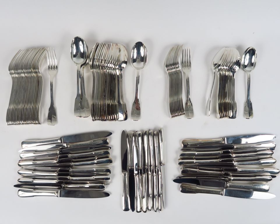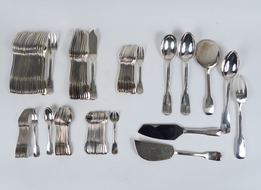 Partie de ménagère en métal argenté, modèle uniplat. Comprenant : - vingt-quatre grands couverts - douze couverts à entremets - vingt-trois grands couteaux - 12 petits couteaux - douze couverts à poisson et douze fourchette à poisson - douze cuillères à dessert - douze fourchettes à gateau - douze fourchettes à huitre - douze fourchettes à escargot - différents couverts de service (cuillère à glace, pelle à tarte, couvert à salade, cuillère à ragoût etc …)