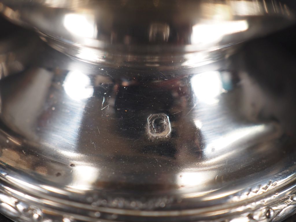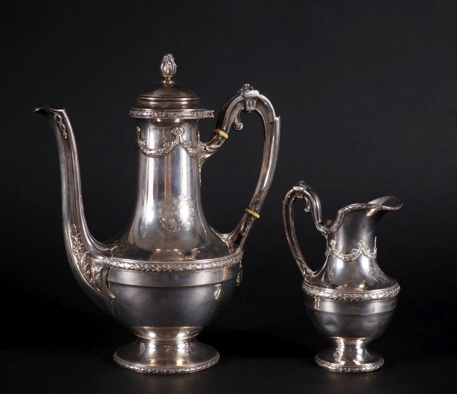 Partie de service à café en argent 925, de style Louis XVI à décor de guirlandes de laurier comprenant une théière et un pot à lait Poinçon Minerve MO : DR PARIS Poids : 820 g (petit enfoncement)