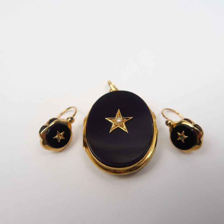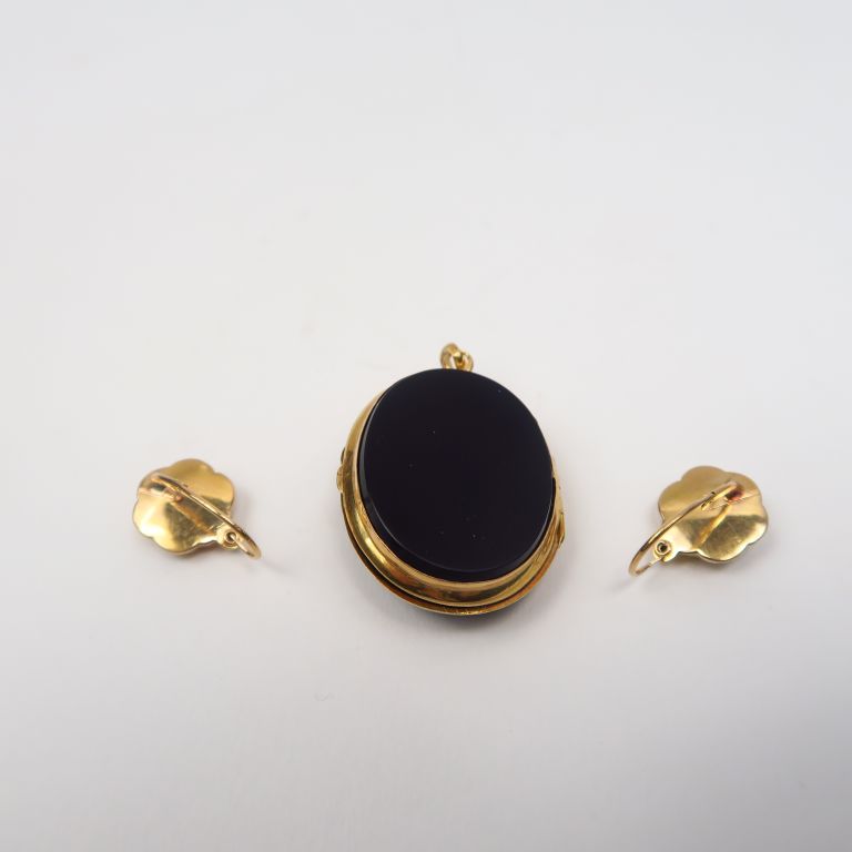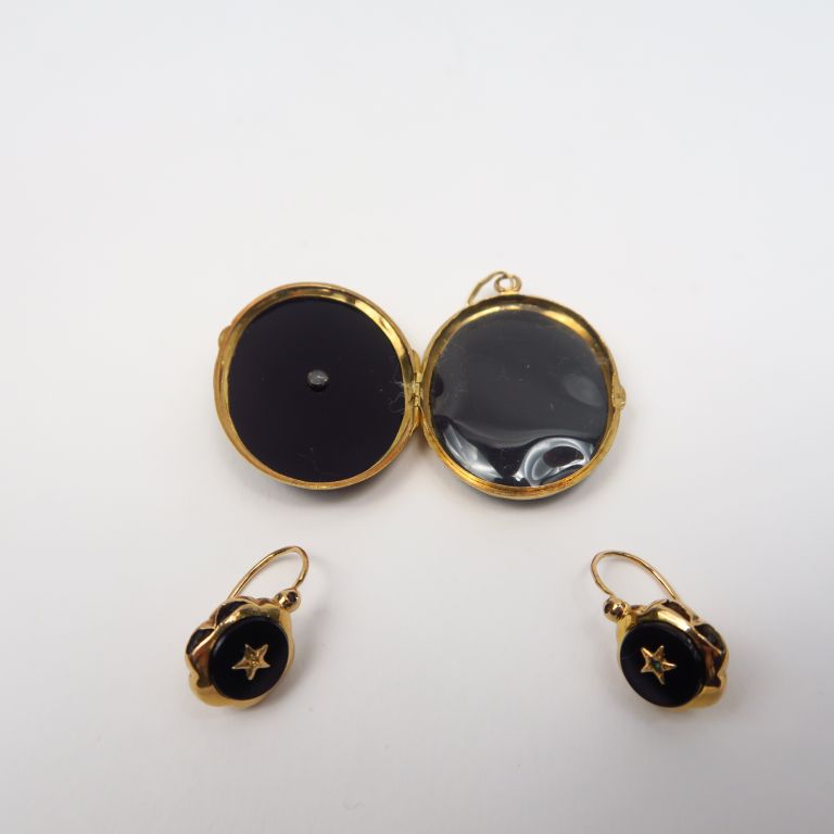 Parure Napoléon III en or et onyx comprenant un porte photo et une paire de perce oreilles. Poids tel. 9,42 g