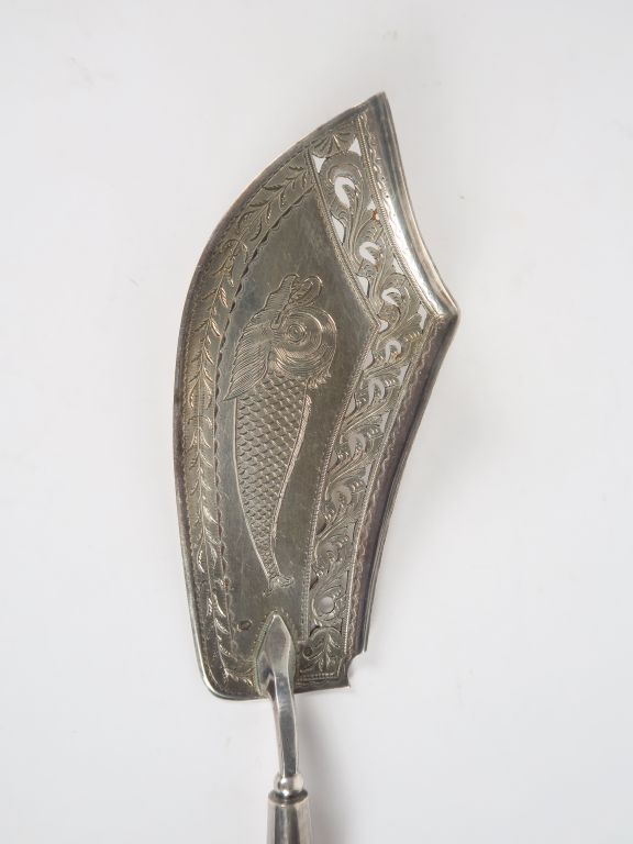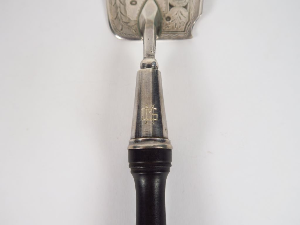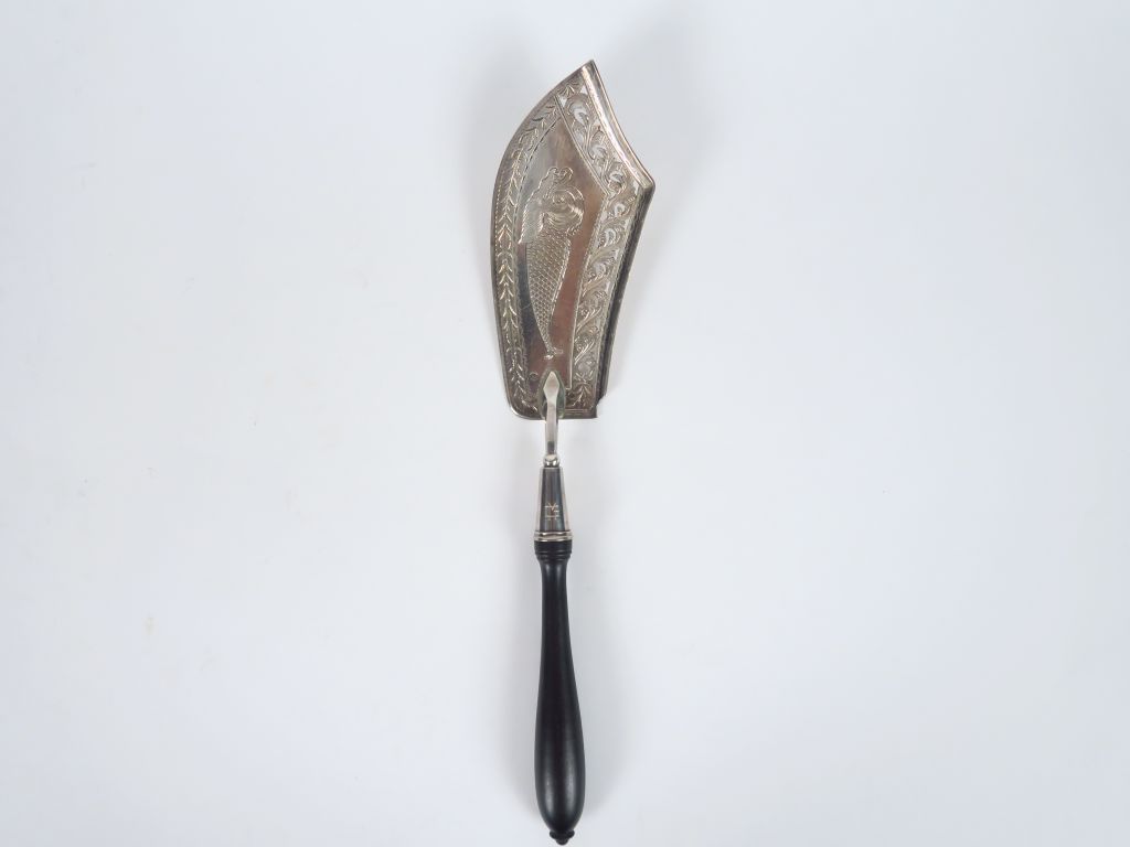 Pelle à poisson en argent, poinçon au coq, à décor gravé de dauphin, manche en ébène. Poids tel. 156 gr