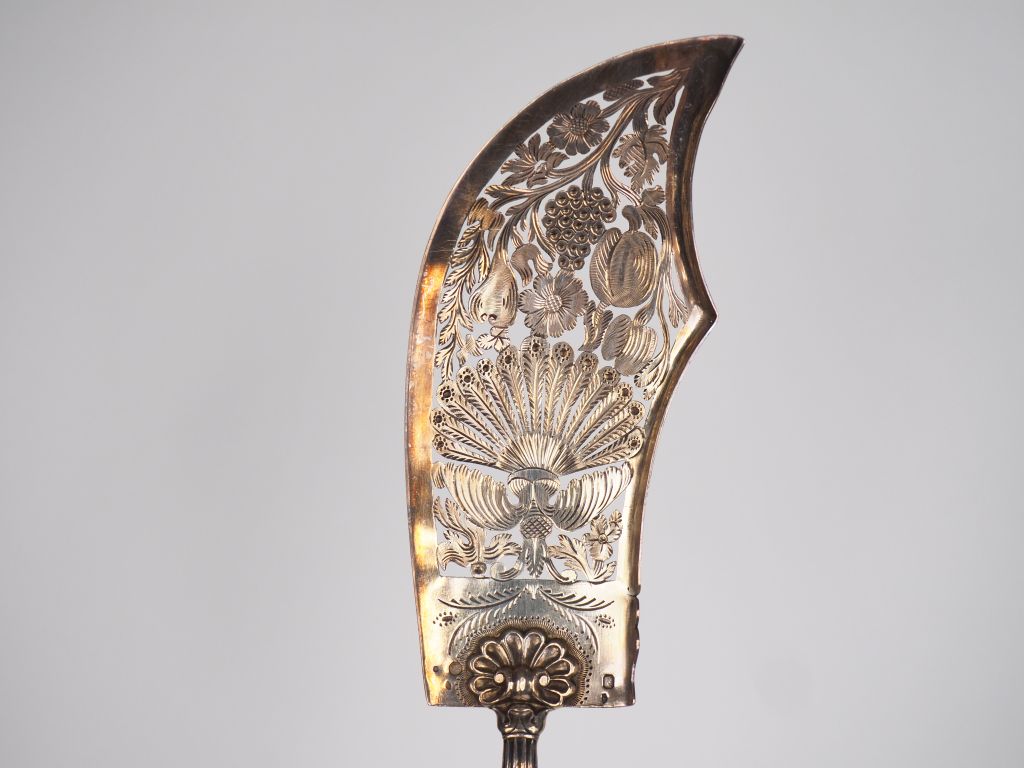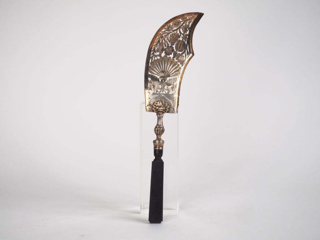 Pelle à servir le poisson Restauration en argent, poinçon Minerve, à décor ajouré de fleurs et de feuillage. Manche en ébène. Long. 33 cm Poids tel. 132 g