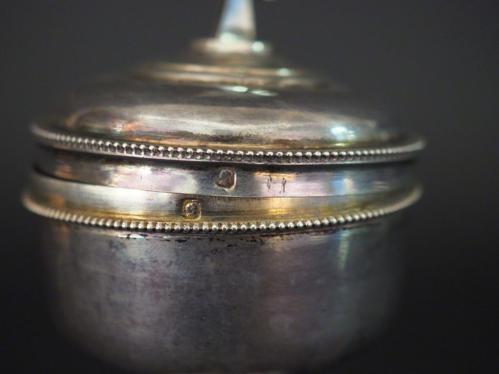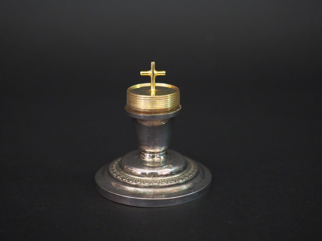 Petit ciboire de voyage en argent, poinçon Minerve, surmonté d'une croix. Le fut se dévissant et laissant découvrir une petite croix et un petit réservoir à Saint Chrême. La base à décor d'une frise de feuillage. H. 11,5 cm Poids. 77 g