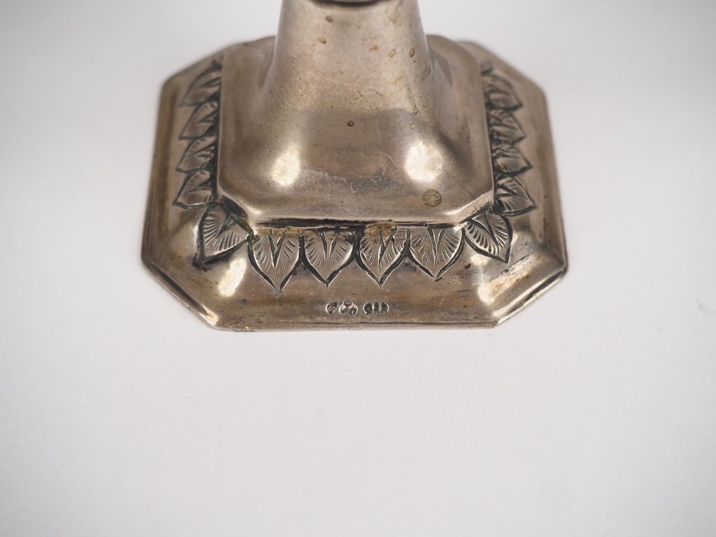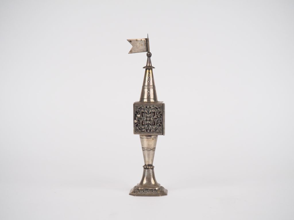 Petit encensoir (?) en argent étranger, à décor ajouré de feuillage. La base ornée d'une frise de feuilles et le haut d'un drapeau. H. 23 cm Poids. 167 g