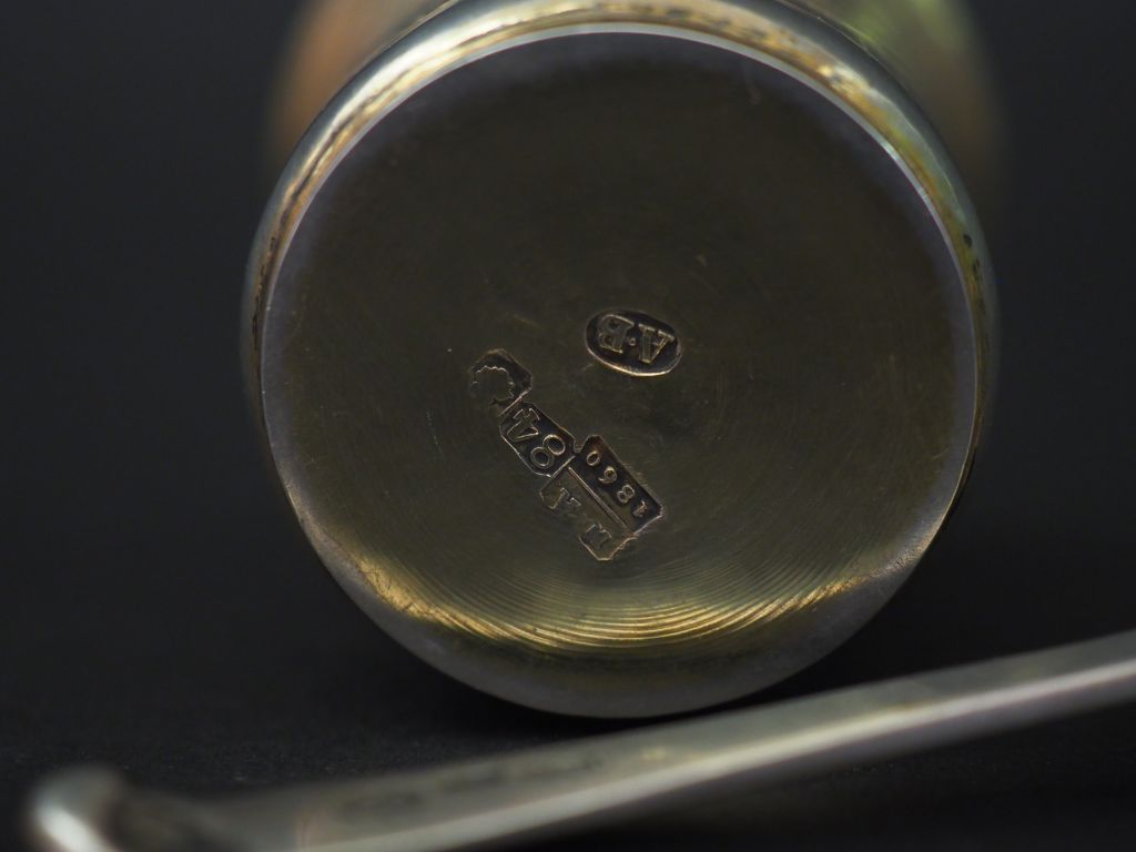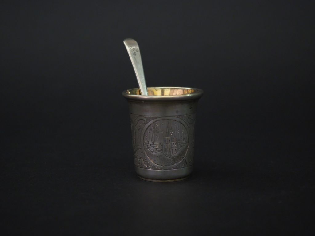 Petit gobelet en argent russe, à décor de rinceaux et de paysages dans des réserves. Daté 1860. Monogrammé. H. 5 cm On y joint une petite cuillère en argent et vermeil russe. Monogrammée. Poids. de l’ensemble : 48 g