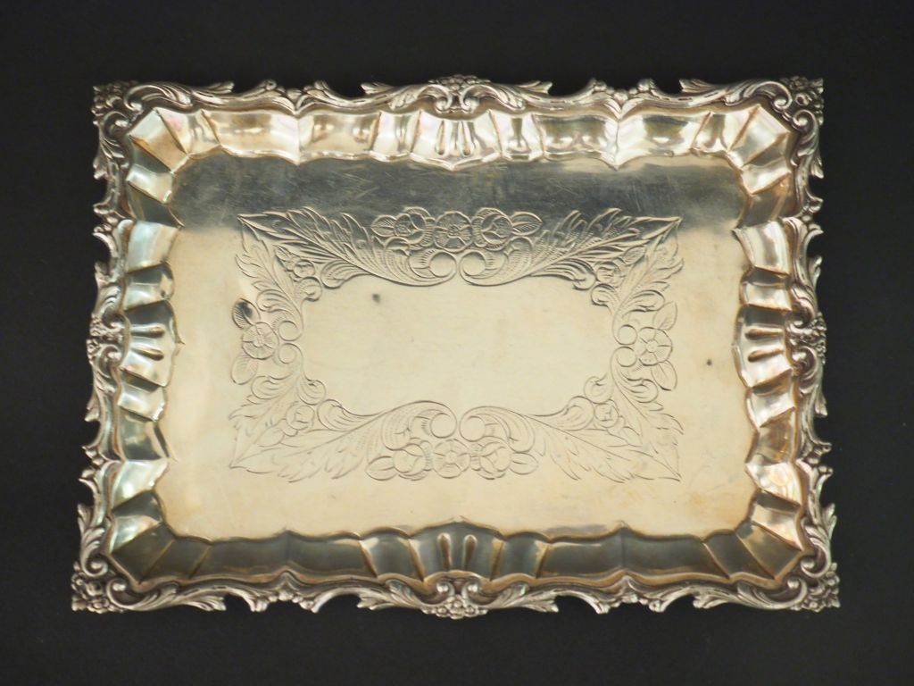 Petit plateau Napoléon III en argent, à décor de rinceaux et de fleurs. Reposant sur quatre petits pieds feuillagés. H. 1,8 cm 16 x 21,2 cm Poids. 225 g