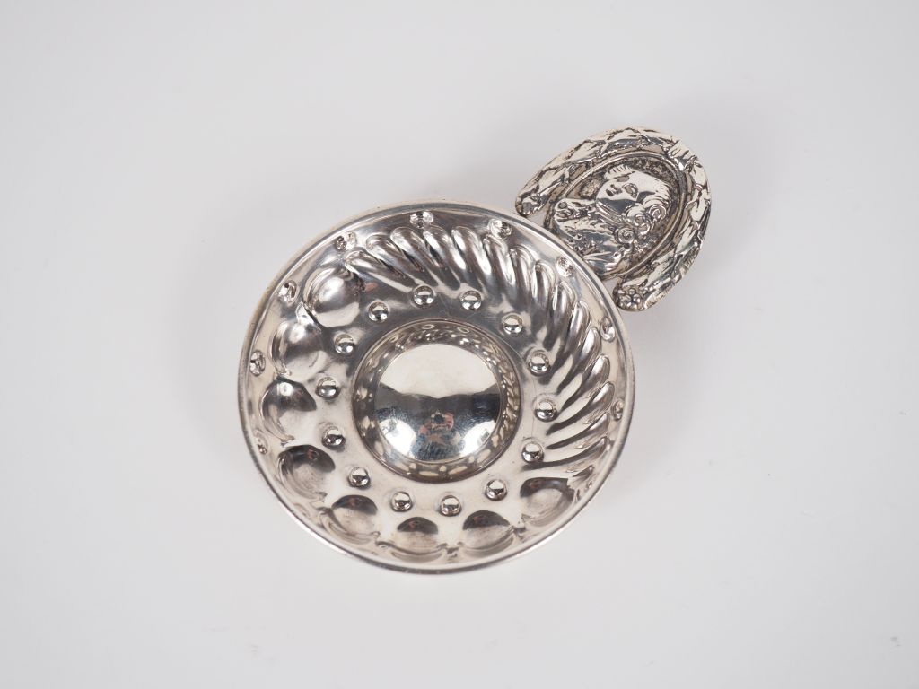 Petit taste-vin en argent 800, poinçon Minerve, à décor de côtes torses et pastilles. Anses, à décor de personnage. Diam. 6,5 cm Long. 9,5 cm Poids. 47 g
