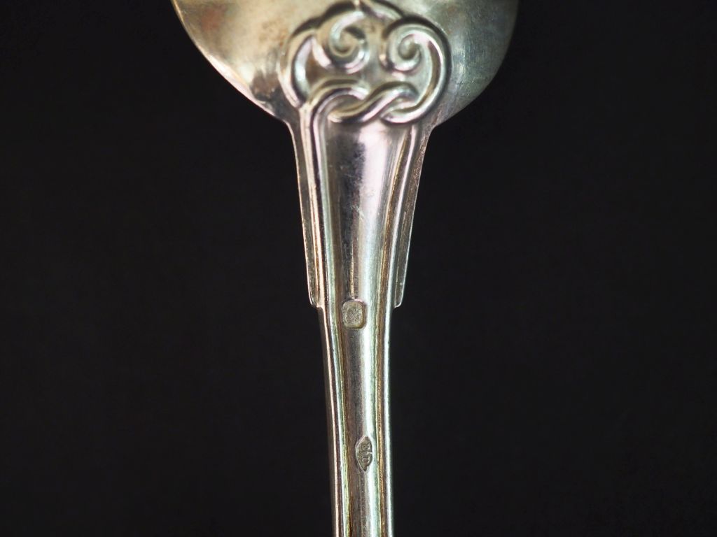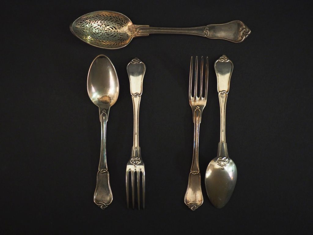 Petite cuillère à olive en argent, Napoléon III, poinçon Minerve 2 couverts à entremets Napoléon III en argent, poinçon Minerve, modèle à entrelacs. Poids : 285 g