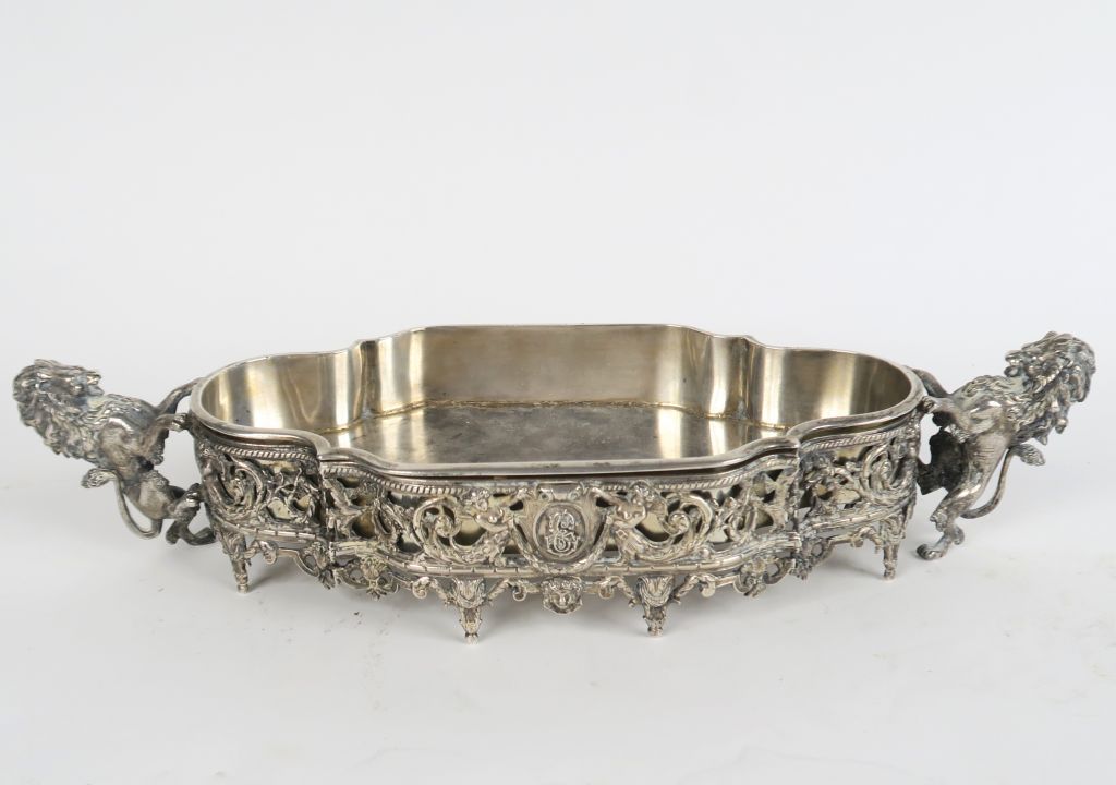 Petite jardinière ou centre de table de style Louis XVI en argent, anses en forme de lion rugissant, bordure ajourée à décor de monogramme et de frise d'amours, de feuillage et de fleurs. Dim. 6 x 33 cm Poids tel : 665 g